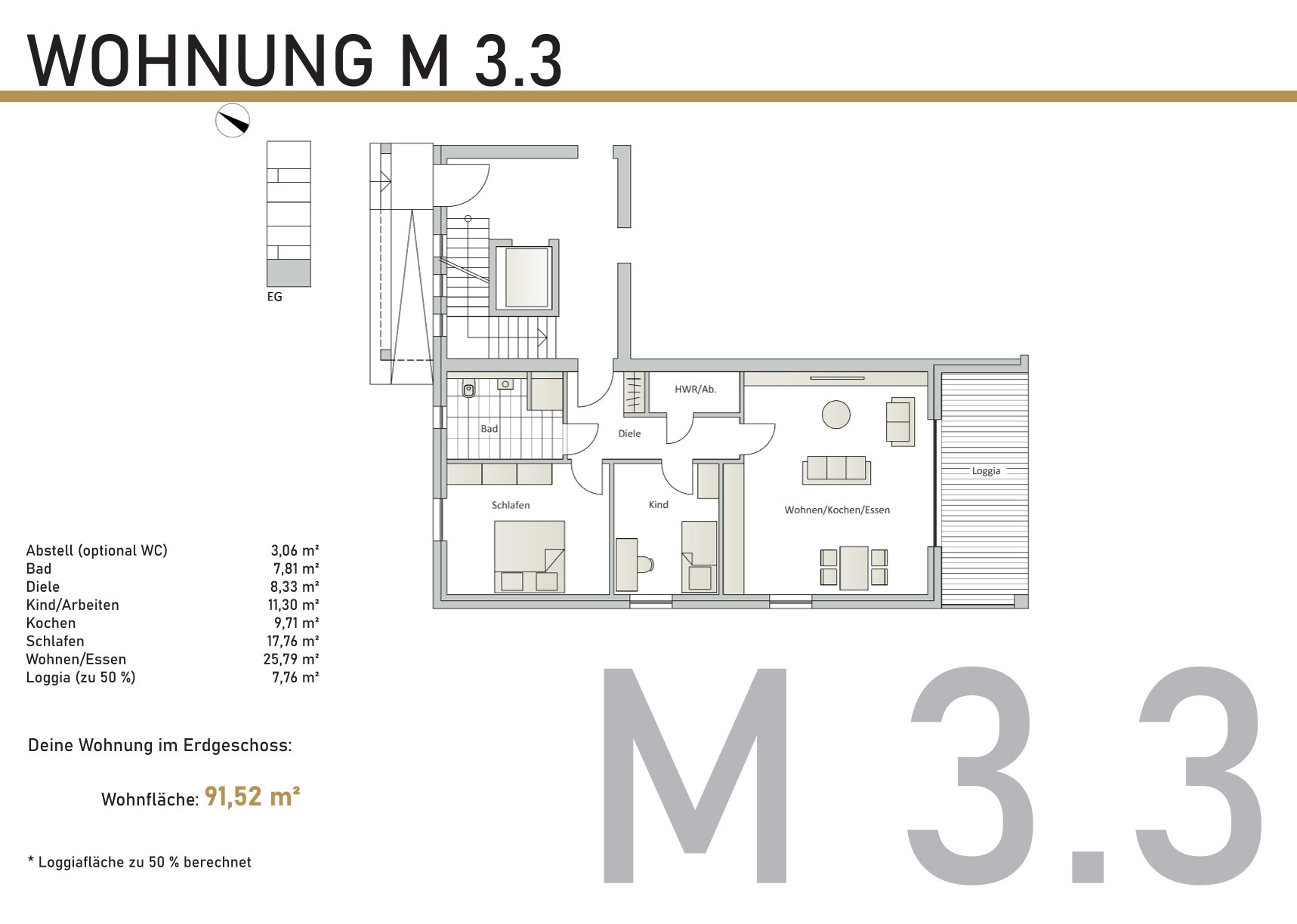Wohnung 3.3 in den Merkurhöfen (EG) mit ca. 91,52 m² Wohnfläche. Praktische Raumaufteilung mit Wohnen/Essen, separater Küche, Schlafzimmer, Kinder-/Arbeitszimmer, Bad und optionalem WC/Abstellraum. Loggia vorhanden.